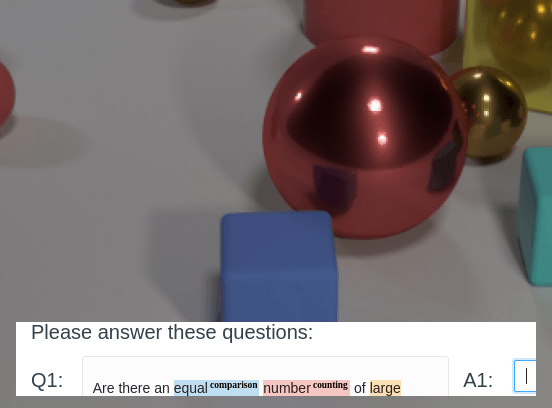 Use the Labels control tag to apply specific labels to the first question about the image, to classify specific parts of the question being asked about the image: