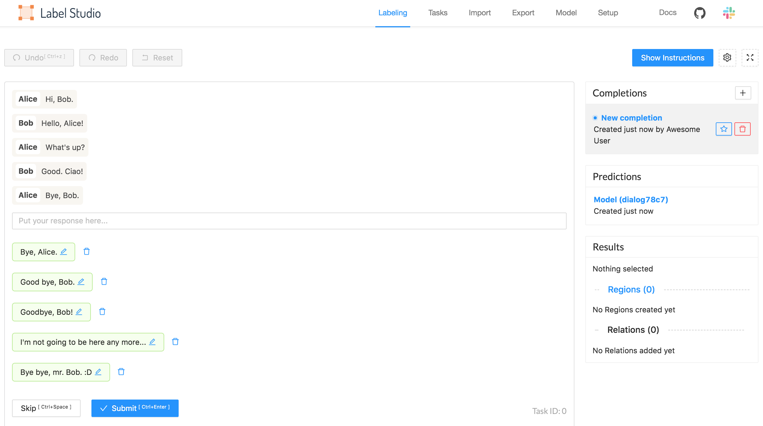 it connects a GPT2-like language model to the Label Studio UI, giving you an opportunity to explore different text responses based on the chat history.